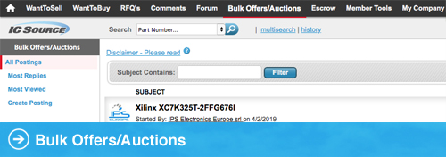 Our Bulk Offers/Auctions tool provides yet another way to market your products and offerings on IC Source. Easily post your items for sale or for bid in a discussion-like format.