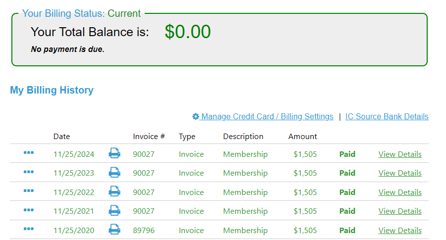 IC Source Members can view their invoices and other financial transactions under My Company β Billing.